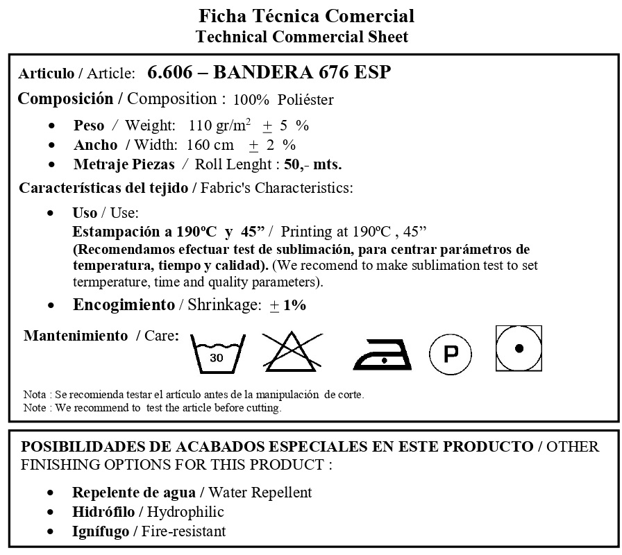 Composition : 100% Polyester Weight: 110 gr/m2 + 5 % Width: 160 cm + 2 % Roll Lenght : 50,- mts.