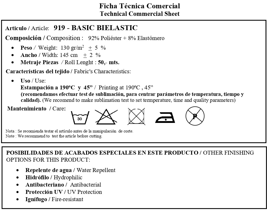 Composition : 92% Polyester + 8% Elastomere Weight: 130 gr/m2 + 5 % Width: 145 cm + 2 % Roll Lenght : 50,- mts.