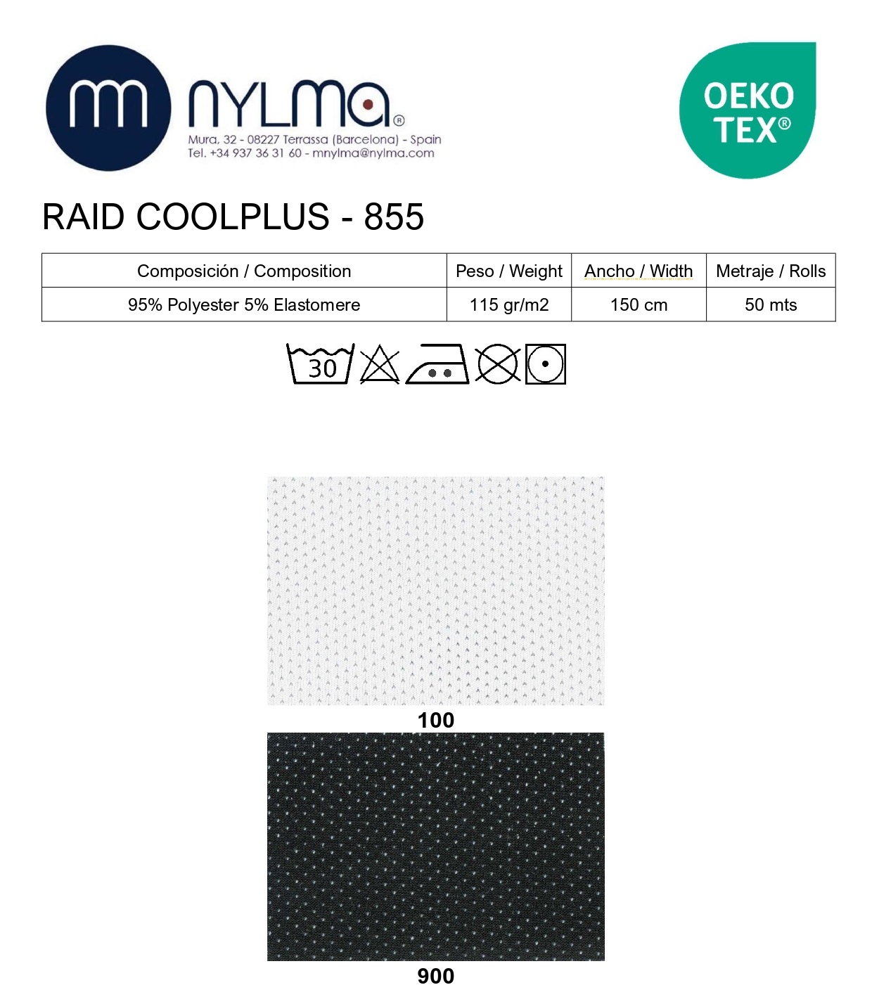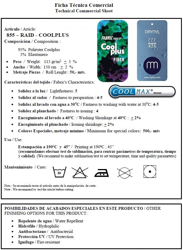 Composition : 95% Polyester Coolplus 5% Elastomere • Weight: 115 gr/m2 + 5 % • Width: 150 cm + 2 % • Roll Lenght : 50,- mts.